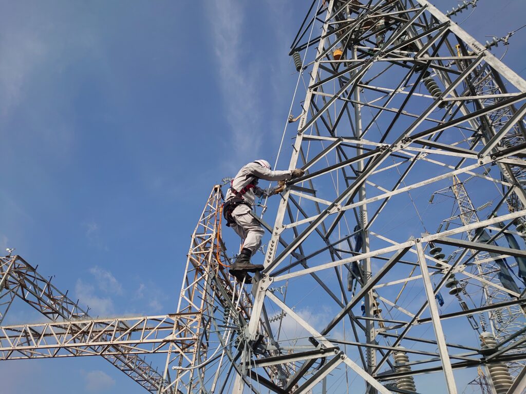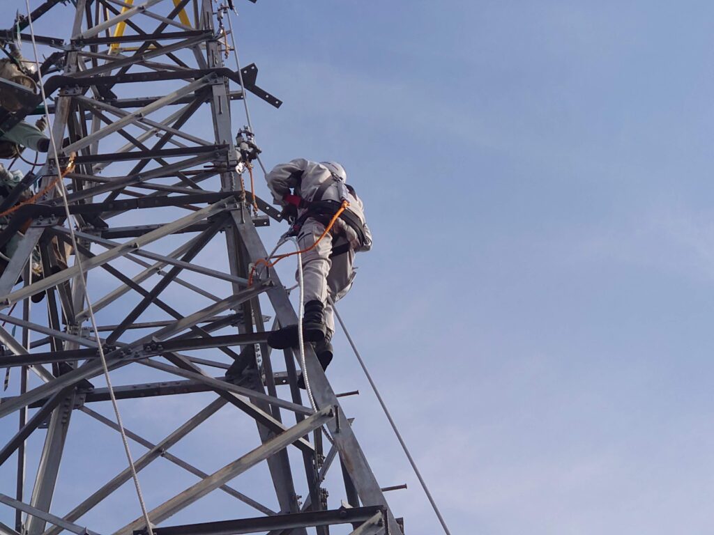 今回登ったのは、高さ約40メートルの鉄塔。 下から見上げると足がすくむような高さですが、T君は安全帯をしっかり確認し、一歩ずつ高度を上げていきます。