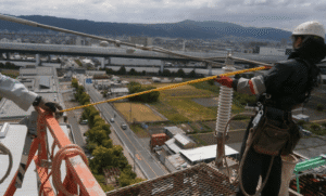 発電所でつくられた電気を変電所や利用者まで届けるための高圧電線を設置・保守する工事です。航空機航行の際、鉄塔に当たらないための航空障害灯を改修、維持したり、送電線が雷害や鳥害によって切れないよう様々な機器を取付けや修繕などを行っています。